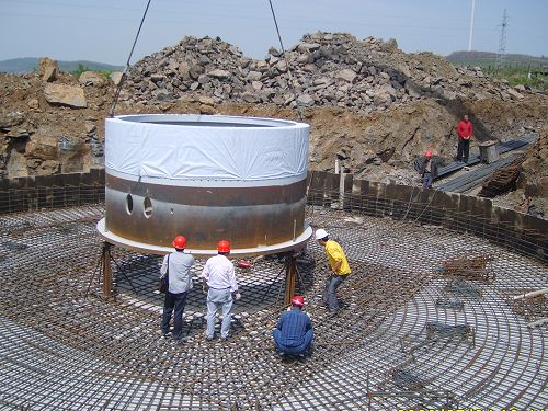 本次风机基础浇注地点为蓬莱以西八公里处平顶山区,风电公司自 4月份进驻施工现场后,立即投入到紧张的工作当中,风餐露宿,实际察看,在较短时间内就将风机道路设计图绘制完成,虽然这次工程量不大,但公司领导十分重视,项目部管理人员克服工期紧张、材料价格、风机基础质量要求高等不利因素,积极和业主以及监理协调沟通,使工程进度很快得到提高。短短的五天内,钢筋绑扎完成,基础环安装完成,混凝土浇筑完成。
