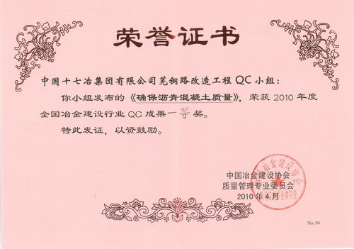 芜铜路改造工程QC小组的《确保沥青混凝土质量》(完成人:邵传林)荣获一等奖,宝钢集团浦钢罗泾二步工程QC小组的《开展QC活动,提高罗泾二步炼钢工程砼构筑物观感质量》(完成人:王黎明)、路桥公司淮钢项目经理部QC小组的《运用QC方法,提高大型预制柱施工质量》(完成人:陶家长)、风电公司海上大型风电机组安装质量控制QC小组的《海上大型风电机组安装质量控制》(完成人:仝茂祥)荣获二等奖。