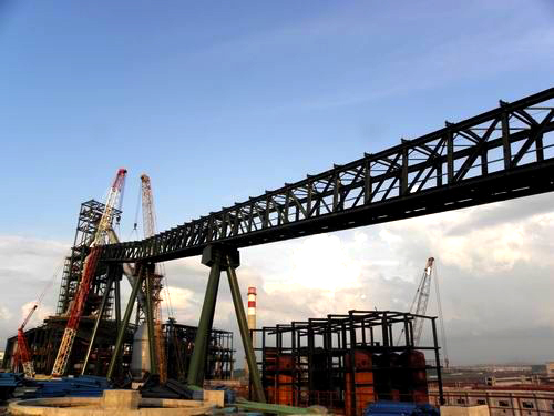 一号高炉主皮带机通廊,从矿槽转运站到高炉上料口,全长378米,坡度966度,最高点67米,钢结构总重量1238吨,是高炉系统的一个重点项目。今年三月底一号高炉工程刚开工,项目部就确定一位副经理专门负责组织通廊的制作和安装工作。经过工程技术人员和两个钢构作业处辛勤努力,七跨通廊、五个支架相继制作和组装完工。720日上午,项目部抽调工业建设公司机装二处和三个机装处的精兵强将组成突击队,冒着大雨,成功完成了两段通廊吊装与对接。