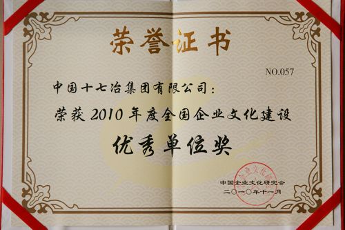 111315日,中国企业文化研究会以新中国60年企业精神传承与创新为主题的中外企业文化2010北京峰会隆重举行,中国十七冶集团荣获“全国企业文化建设优秀单位”称号。全国人大常委会原副委员长何鲁丽、成思危、许嘉璐、蒋正华出席会议并作论坛主旨发言。600多位来自国有大中型企业和知名民营企业的负责人参加了会议。
