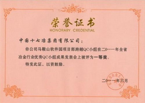 获得奖项的还有:马鞍山软件园项目部跨越QC小组获“优秀QC小组”一等奖1项;灌云风电场土建安装工程、保证减定径机组润滑管道冲洗质量、提高梅钢二期公辅工程砼建(构)筑物的观感质量、马鞍山市东部污水处理厂一期工程项目经理部等4QC小组获“优秀QC小组”三等奖;市政工程技术公司总工程师刘伟获“QC小组活动卓越领导者奖”。