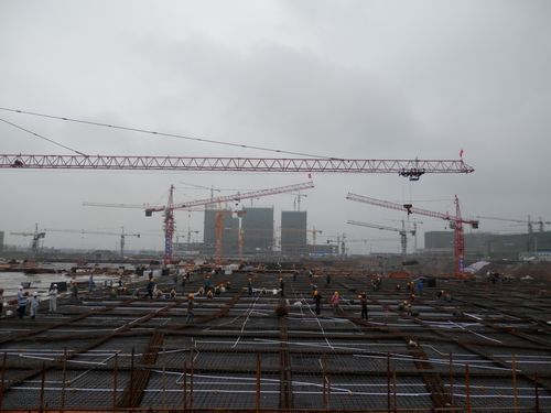 目前,项目部提出了“抢白天,战黑夜,争分夺秒一个月”的口号,不断加大资源配置力度,现场劳动力已增加到2000人,人员和设备两班作业,每天制作安装钢筋600吨以上,浇筑混凝土超过5000立方米,施工形象进度达到了“一时一个样,一天出形象的效果”。