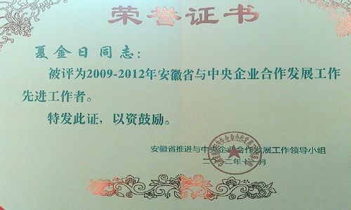 夏金日同志获安徽省与央企合作发展先进工作者称号