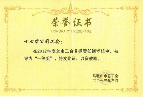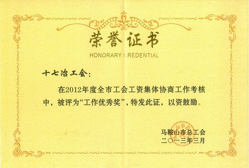 327,在马鞍山市总工会十一届五次全委会(扩大)会议暨工资集体协商“春季要约行动”启动仪式上,中国十七冶集团工会获“2012年度工会工作目标责任制考核先进单位一等奖”和“2012年度全市工会工资集体协商工作先进单位优秀奖”两项荣誉称号,受到大会表彰。