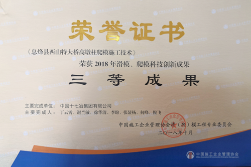 11月28日,从中国施工企业管理协会传来喜讯,中国十七冶集团有限公司交通工程技术分公司承建的贵州息烽县团圆山环线项目《息烽县西山特大桥高墩柱爬模施工技术》获2018年滑模、爬模科技创新成果三等成果。