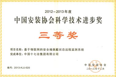 获得2012-2013年度中国安装协会科学技术进步奖的分别为公司信息化部完成的《基于物联网的安全绳佩戴状态远程监测系统》和冶金工程技术公司完成的《特高压实验室电气安装、调试新技术》。这2项科学技术进步奖的成功获得,充分体现了公司对科技创新工作的高度重视、广大技术人员过硬的专业技术水平以及十七冶人为推进公司可持续发展的持续创新精神。