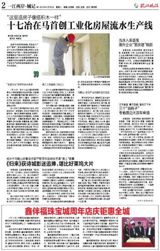 52021日,马鞍山市主流媒体《皖江晚报》和《马鞍山日报》以及马鞍山广播电台分别对中国十七冶集团研发生产的住宅产业化配套产品柯瑞司牌绿色自保温组装式轻质墙板投入使用进行了报道。