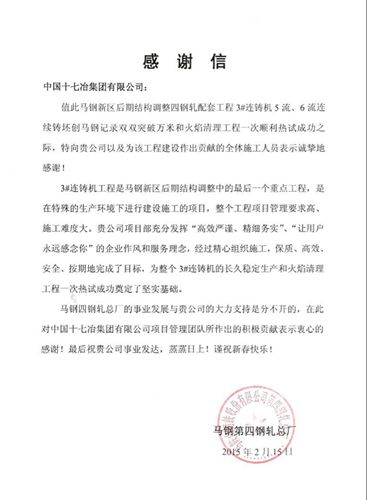 日前,马钢第四钢轧总厂向中国十七冶集团发来感谢信,感谢十七冶冶金工程技术公司在承建马钢新区后期结构调整四钢轧配套工程中3#连铸机5流、6流连续铸坯创马钢记录,双双突破万米,同时承建的火焰清理工程一次顺利热试成功。