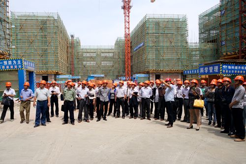 此次参观活动由金寨县安监站站长李峰带队,共有60多位乡镇安全负责人到现场参观。李站长向大家介绍了金园中心学校工程和金园学府工程的基本情况,然后结合现场的围挡、门禁系统、外脚手架的搭设、塔吊的安装和操作、物料提升机的安装和操作、钢筋加工棚的规范搭设以及“三宝、四口、五临边”向各位安全负责人一一做出了讲解。各位乡镇安全负责人对工程的质量和安全都给予了高度的评价,并且表示要向当地的施工企业进行宣传,学习十七冶的施工管理。