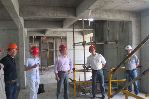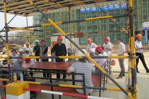 本次活动由含山县质监站站长葛从林带队。在施工现场,他向大家介绍了西苑A区工程的基本情况,并结合现场的质量、安全、文明施工、模板支撑架、工程实体质量等方面向各位负责人一一进行了讲解。在项目部的带领下,质监站一行参观了1#楼和2#楼,各位负责人对现场工程的质量和安全管理给予了高度的评价,并表示当地的施工企业要学习十七冶的管理模式,提高当地建筑业的管理水平。