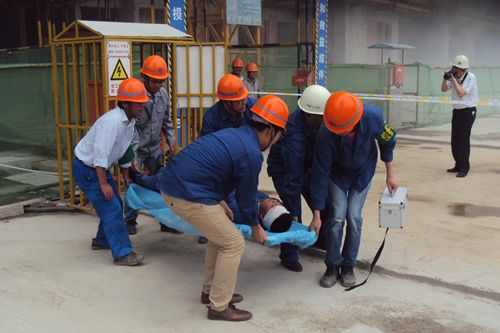 公司对此次应急救援演练事先做出了精心策划和细致安排。下午3时,总指挥、公司安监部部长做演练动员并发出演练开始指令。两名施工人员模拟报告在建施工的7#6层悬挑脚手架外安全防护立网起火火警,项目经理即刻启动突发事故应急处救援预案,现场迅速进入紧张而有序的应急救援氛围,抢险救援小组同时展开警戒隔离、人员疏散和干粉灭火器灭火。308分,现场高呼有人触电,救援人员立即以方木挑开电源线,关闭电闸,以担架转移触电人员并及时实施检查、包扎、抢救,救援车及时跟进载受伤人员到医院救治。