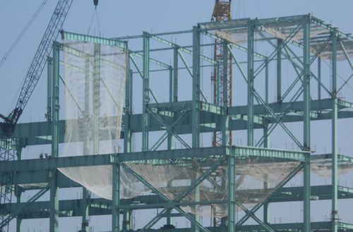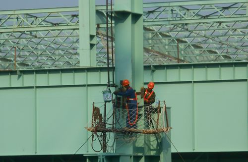 项目部针对现场高空作业多,厂房跨度大等特点,创新安全网悬挂措施。他们率先在长120米、宽24米,高31.5米的铁包间屋面钢结构安装中,采用“移动式安全网工作法”,在厂房两端的行列钢柱上选择合适的位置拉上钢丝绳,把安全网串在钢丝绳上固定,随着安装位置的移动,解开固定后沿着钢丝绳平移安全网,既减少了安全网的使用数量,又方便了安全网的移装,从而提高了功效,节约了人工成本。