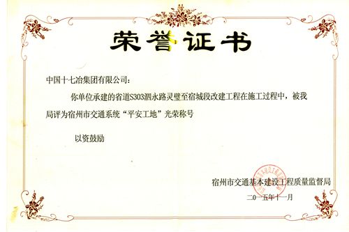 1117,从宿州市交通基本建设工程质量监督局传来喜讯,由中国十七冶集团路桥公司承建的S303泗永路灵璧至宿城段改建工程项目荣获宿州市交通系统“平安工地”光荣称号。