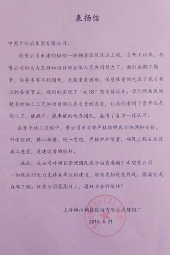 421日上午,上海梅山钢铁股份有限公司炼钢厂向中国十七冶集团发来表扬信,表扬冶金工程技术公司在梅钢一炼钢渣滚筒项目面对各种不利因素,如期完成热负荷的出色表现。