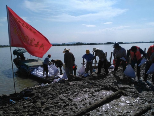 77中午12:00,博望区花津村水位12.78,超过历史最高水位0.5830名抗洪抢险突击队队员来到运粮河与姑溪河交界处,排成人墙搬运沙袋和石子,加固洼地,为6万亩良田护堤。中冶置业(安徽)公司党委书记徐良蓉号召全体突击队队员和党员,发扬责任意识和担当精神,不怕苦、不怕累,遵守纪律,服从指挥,打赢防汛抢险救灾这场硬仗。
