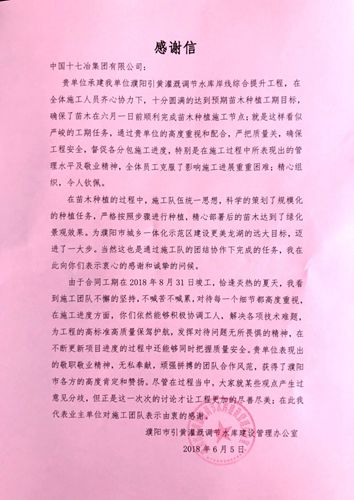 濮阳城乡一体化示范区水库办向十七冶致感谢信