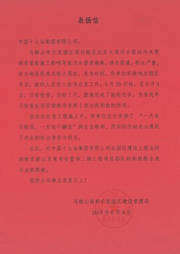 6月8日,马鞍山南部示范园区建设管理局向中国十七冶集团致表扬信,表扬十七冶常韦安置房二期工程项目部积极响应园区号召,勇担社会责任,在应急抢险施工中发挥了突出作用。