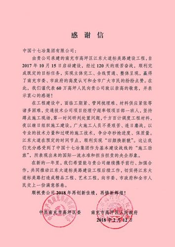 感谢信中表示,在中国十七冶集团的大力支持和帮助下,贵州绥阳锰系合金工程项目的安全文明施工取得了阶段性成果,为下一步的施工生产打下了良好的基础。感谢信对十七冶领导的关心和支持和参与项目建设员工的辛勤付出,表示衷心的感谢和由衷的敬意。