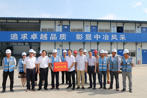 7月26日下午,马鞍山市总工会党组成员、经审会主任汪福海,经济工作部部长孙高康,经审办主任张思平一行到中国十七冶集团房屋工程技术分公司马鞍山经开区南区教育园项目部开展“送清凉”活动,为奋斗在一线的员工送来了防暑降温物品。中国十七冶集团工会副主席、党委工作部部长杨绍凤和房屋公司工会主席、副经理张文忠参加慰问。