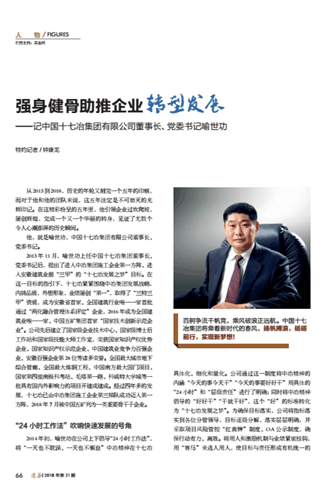 11月5日,《建筑》杂志2018年21期出版发行,中国十七冶集团董事长、党委书记喻世功荣登该期封面人物,同时以《强身健骨助推企业转型发展》为题,对喻世功董事长推动企业转型发展进行了专题报道。