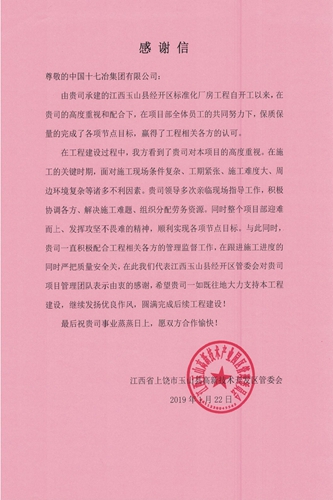 1月22日,江西省上饶市玉山县高新技术开发区管委会向中国十七冶集团发来表扬信,表扬管廊工程技术分公司江西玉山县经开区标准化厂房工程项目部在工程建设中做出的突出贡献。