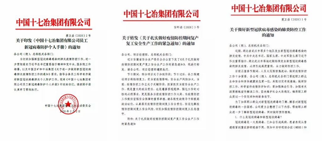 自开展新型冠状病毒肺炎疫情防控以来,中国十七冶集团高度重视,坚决落实中共中央和国务院对防控新型冠状病毒感染的肺炎疫情做出的重要指示,深入贯彻中国五矿集团和中冶集团及地方政府对此项工作的具体要求。公司上下联动,严防死守确保疫情防控工作成效显著,截止目前公司没有一人感染,为复工生产打下了坚实基础。在做好疫情防控工作的同时,公司目前正积极推进复工复产工作。
