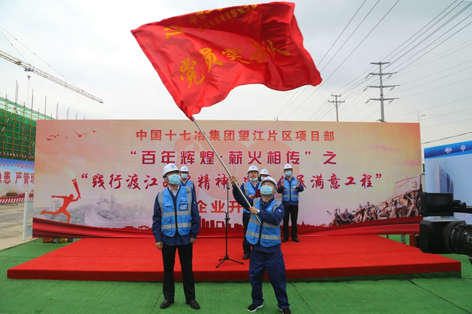 在办实事、开新局环节,项目现场举办党员先锋队成立仪式,中国十七冶集团纪委书记、副总经理蔡进向望江片区项目部授旗,要求项目部要将渡江战役精神贯彻到施工生产一线中,在创优创先精品工程过程中勇于争先,建设人民满意工程。片区项目负责人刘鎏与中冶置业(安徽)公司党委书记徐良蓉分别代表项目全体作业人员与领导干部团队作表态发言,表示将把“渡江战役精神”落实到项目建设中,争取提前完成施工,让项目早日发挥经济效益,促进驻地地方经济发展,展现十七冶员工“干在实处、走在前列”的卓越风采。最后,项目负责人带领大家参观了项目现场,介绍望江片区在建项目的建设意义、板块拓展、智慧工地、安全管理、绿色施工、门禁系统使用、企业文化等,展示了项目部运用现代化技术、标准化管理建造人民满意工程的过程以及企业品牌形象,讲述了项目团队凝心聚力、履行央企责任、体现央企担当的基层故事以及将渡江战役精神与项目建设的实际行动相融合的过程。