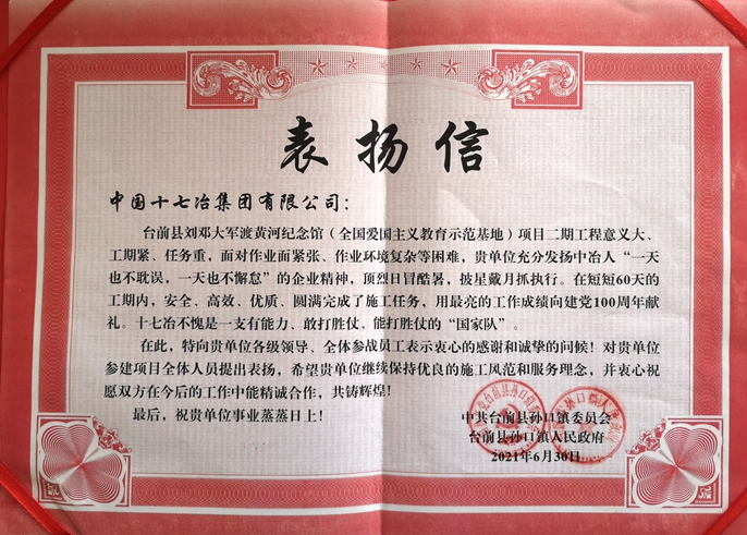6月30日,中国十七冶集团交通分公司承建的全国爱国主义教育示范基地河南台前县刘邓大军渡黄河纪念馆项目竣工。濮阳市人大常委会副主任、台前县委书记常奇民,台前县委副书记、县长王俊海等领导为纪念馆揭牌,并向十七冶赠送锦旗及表扬信。