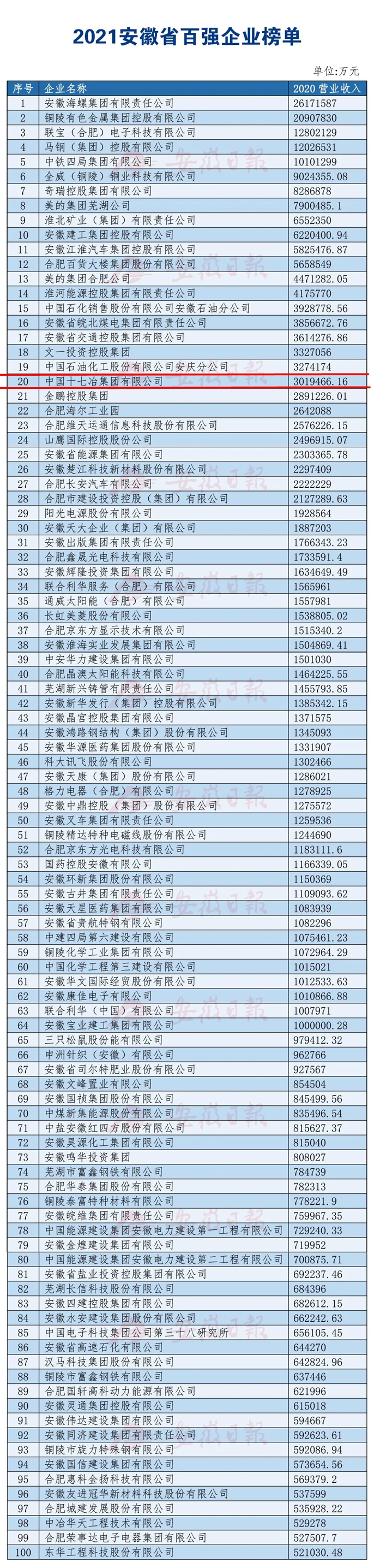 根据中国企联的统一部署,安徽省连续17年开展了安徽企业百强申报排序活动。本次根据企业自愿申报,有关机构确认,以2020年营业收入为标准。公司在2021年安徽省百强企业排名第20位,较去年前进一位。