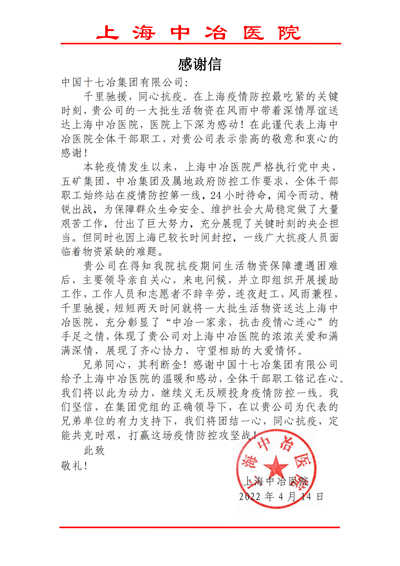 4月16日,上海中冶医院向中国十七冶集团致感谢信,对公司在防疫关键时刻紧急驰援了一大批生活物资表达了深切的感谢之情。