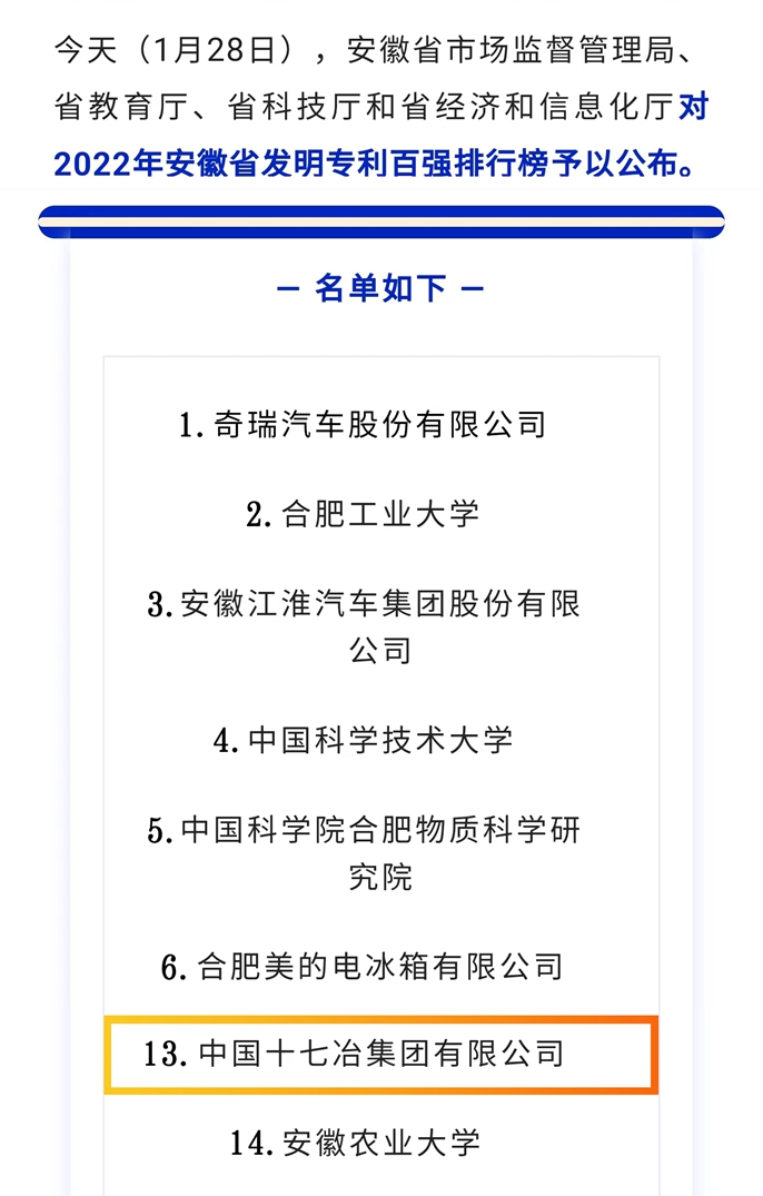 1月28日,兔年开工首日,安徽省市场监督管理局、省教育厅、省科技厅和省经济和信息化厅联合发布2022年安徽省发明专利百强排行榜,中国十七冶集团位居全省第13位、安徽省建筑行业首位,较去年前进3位。