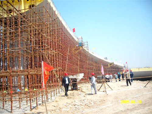 423日,滨江大道淮河路NE匝道桥第一阶段(3#墩~5#墩、十五个梁段)钢箱梁的架设、拼装和焊接工作一次成优,经工程技术部门各项检测合格率为100%,施工进度、安全、质量均受到业主、监理、设计和专家们的一致好评。
