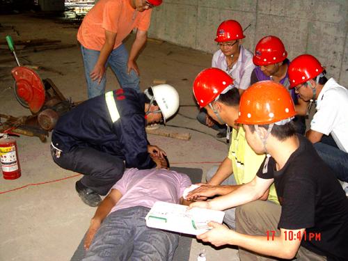随着芜湖海螺大厦工程施工面积的不断扩展,层高不断增加,施工人员也不断增多,施工用电逐渐进入了高峰期。为确保施工用电安全,项目部在加强安全用电教育的同时,还给员工印发了《安全用电须知》宣传单,并编制了《触电事故应急预案》,成立了触电事故应急救助小组。在此次触电急救演练活动中,安全员夏道俊、赵运春模拟触电后的轻、重伤、烧伤等现状,为参演员工演示口对口人工呼吸、胸外心脏挤压以及伤口清创、包扎技术,使大家受到了一次生动的安全用电知识教育。