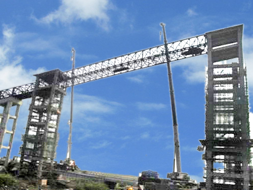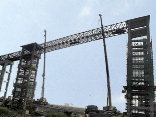 该高支架子项,其钢桁架共5跨,最小跨度为16m,重约18t,最大跨度为44m,重约60t。其中有一节44m大跨为过河跨,地基处于河道边上,地基基本为流沙,且受海水涨潮影响,非常不利于吊车站位,安装难度非常大。该项目部经过慎重考虑,采用200吊车和160吊车抬吊的方案进行吊装。吊装前,采用渣对道路站位区域进行换填,保证满足吊车站位的要求。160t吊车站位于码头输送桥上,200t吊车站位于桥边,一起抬吊。44m大跨钢桁架缓缓升起,顺利就位。随后,其余4跨也相继采取该办法,陆续顺利吊装完成。5跨钢桁架的顺利吊装完成,标志着十七冶象山海螺项目后增的码头高支架工程主体项目全部完工。