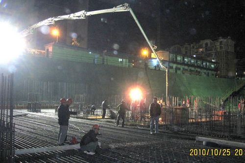 此次浇注混凝土的A底板面积为2000,钢筋绑扎量510t,砼浇注量达5100m³。为了确保此次大体积混凝土一次性浇注成功,金融中心项目部编制并经专家论证了专项施工方案,制定了严密的各种应急措施,精心组织管理人员进行24小时全程监控。