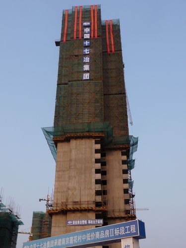 7月22日上午9时18分,十七冶南京河西莲花中低价商品房A04栋主体工程结构封顶。 该单位工程主体地上34层,地下负2层,建筑面积24884.9㎡,建筑高度99.85m,是目前结构封顶中单栋建筑面积最大,建筑高度最高的楼栋。该栋楼主体于2010年10月17日开工,经过全体员工的不懈努力,如期实现封顶。在施工中,其质量、安全曾两次获南京市建筑业协会的肯定。