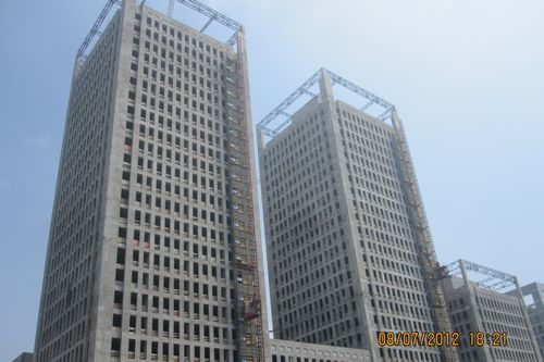 脚手架的拆除是涉及安全等方面的重要施工阶段。为确保安全、快速完成这项难点工程,项目部认真组织安全技术管理人员及协作单位召开专题会,制定出了分三个阶段进行的详细的脚手架拆除专项方案。第一阶段拆除A、B楼一至十层及C楼外排架,直接人工传递到地面,施工难度小,安全系数较高。第二、三阶段拆除A、B楼十一层至二十五层及楼顶安装钢结构的脚手架,拆除的钢管等材料集中在料台上,吊运至地面。