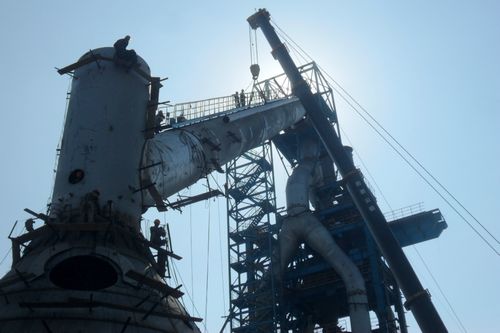 联峰钢铁3#高炉下降管成功吊装