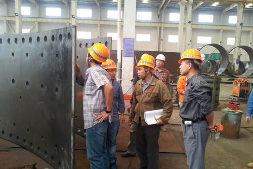 印尼业主代表一行在高炉炉壳制作现场听取了项目的整体规划和制作进展情况汇报,并就项目的工程、质量和现场环境等方面与分公司相关负责人进行深入交流与沟通。在钢结构制作过程中,冶金工程技术公司、江西分公司严格执行公司项目管理制度,精心管理、精心施工,积极提高项目效率,确保工程产品质量。目前,该工程高炉炉壳1-4带、热风炉1-10带、热风炉靴梁等构件通过验收‚一次性合格率为100%‚业主代表给予了高度评价。
