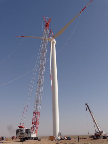 104上午,由十七冶风力与太阳能发电工程技术公司承建的三峡新能源金昌马岗49.5MW风电安装工程首台风机顺利吊装完成。