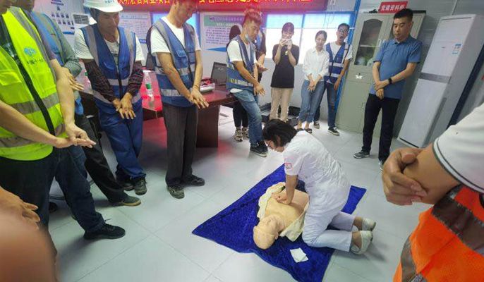在现场,专业医生为大家详细讲解了日常遇到中暑、骨折、触电等意外情况的急救知识以及心肺复苏的主要步骤和关键要点,他还在现场用模拟人进行示范,重点就如何调整体位、打开气道、人工呼吸、胸外心脏按压等急救法详细讲解。授课老师还邀请员工们进行实际操作,掌握手法技巧,通过自身亲自体验,员工们对急救有了更加深刻的认识。此次知识讲座进一步增强了安全生产意识,切实提高了自身的防灾自救能力,有效普及应急急救知识,为项目建设安全文明标准化工地提供了强有力的安全保障。