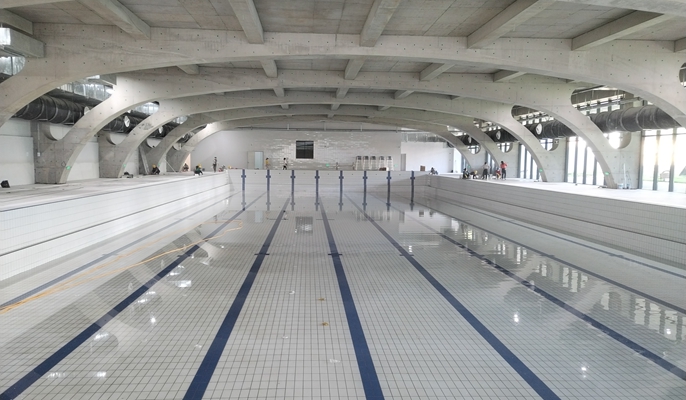 由中国十七冶集团承建的景德镇艺术职业大学A区项目总建筑面积约275460平方米,建设内容主要包括教学楼、宿舍楼、体育馆、产业孵化楼、图书馆、美术馆、行政中心、演艺中心、艺术酒店等16个单体。该项目游泳馆位于体育馆地面层,游泳馆设置8道50米长的标准泳道泳池一座、三个戏水池和两块室外戏水池,泳道深度从1.8米至2米,室外水池1.2米深,戏水池0.6米深。游泳馆场地铺装主要由泳池砖和池岸砖两部分组成。泳池北侧结构柱间固定看台约可坐观众300人左右;泳池南侧赛时可临时布置活动看台,能容纳观众100人左右。