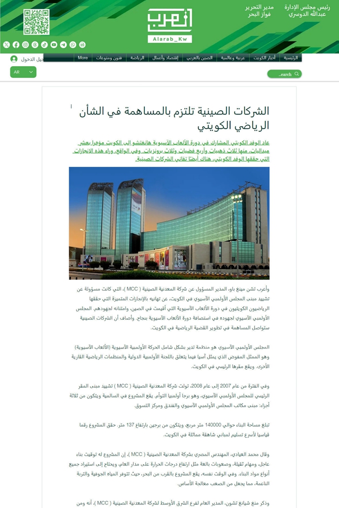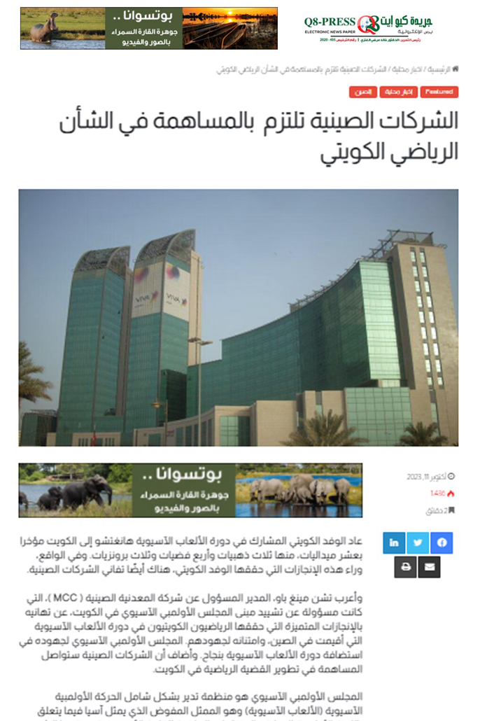 科威特当地时间10月11日,科威特当地主流媒体《阿拉伯人报》《舆论报》以《中国企业致力于为科威特体育事业做贡献》为题,聚焦中国十七冶深入践行“一带一路”倡议,高标准建造亚奥理事会总部大楼,为亚奥理事会工作、科威特体育事业发展作出贡献的建设故事。
