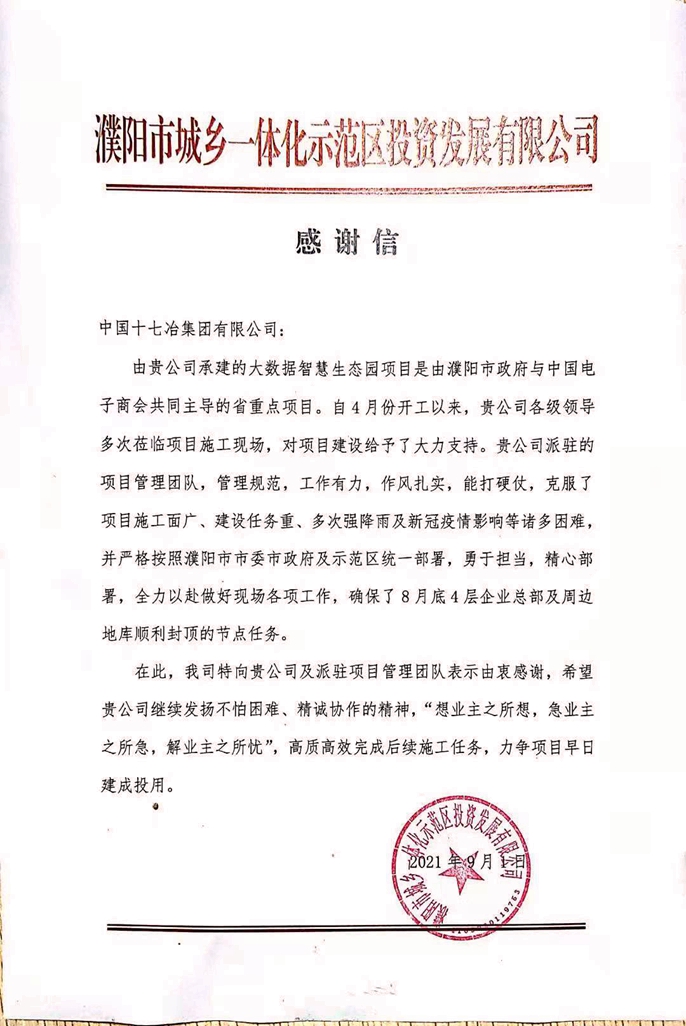 9月1日,濮阳市城乡一体化示范区投资发展有限公司向中国十七冶集团致感谢信,感谢冶金工程技术分公司在其承建的大数据智慧生态园工程项目施工中的优异表现,并向此次参与防汛以及抗疫工作的全体人员表示由衷的感谢。