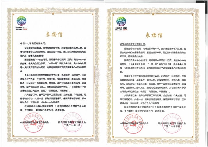 11月12日,西安国际港务区党工委、管委会向中国十七冶集团以及下属的西安金港鼎盛置业有限公司致感谢信,对公司承建的中冶集团西北区域总部项目在全运会期间与西安奥体中心主场馆顺利实现灯光联动表示感谢,对公司广大干部职工展现出的甘于奉献、能打胜仗的担当给予高度赞扬。