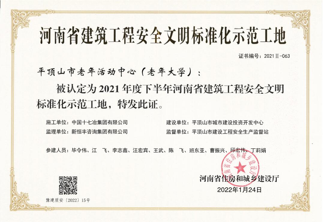 平顶山市老年活动中心工程获评省级建筑工程安全文明标准化示范工地