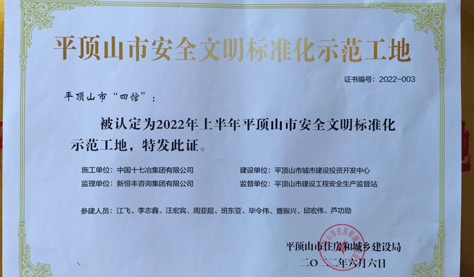 6月22日,从平顶山市住房和城乡建设局获悉,由中国十七冶集团承建的平顶山市“四馆一中心”项目四馆工程被评为2022年上半年平顶山市安全文明标准化示范工地。