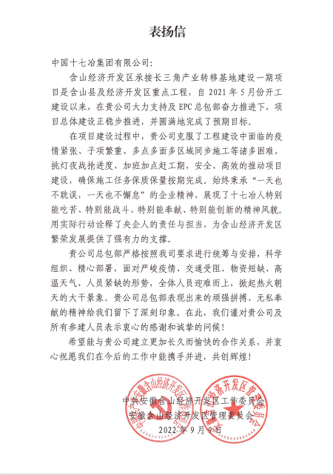 9月15日,中国十七冶集团收到含山经济开发区党工委、管委会致来的表扬信,对路桥工程技术分公司承建的含山经济开发区承接长三角产业转移基地建设一期项目稳步推进、圆满完成预期目标提出表扬并表示感谢。