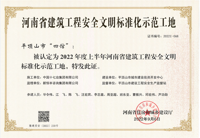 10月19日,从河南省住房和城乡建设厅获悉,中国十七冶集团承建的平顶山市“四馆”工程荣获“河南省建筑工程安全文明标准化示范工地”称号。