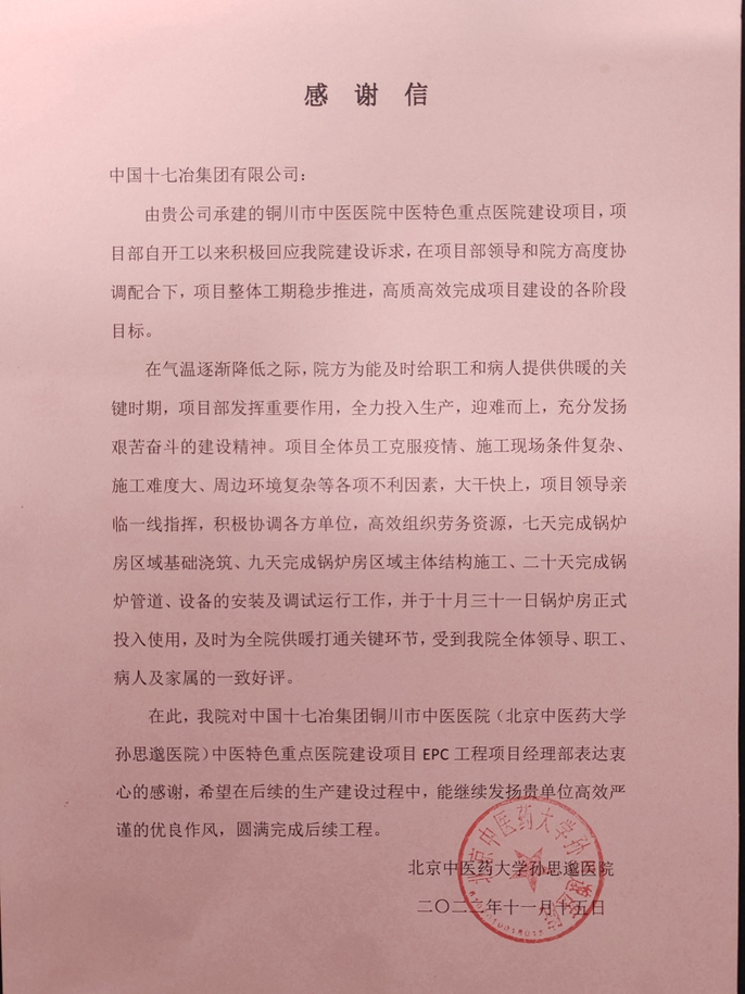 11月15日上午,北京中医药大学孙思邈医院向中国十七冶集团发来感谢信,